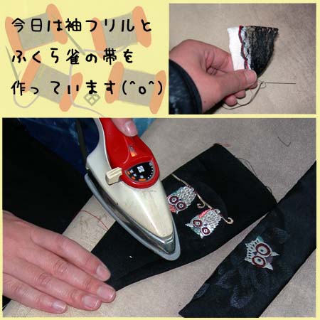 着付け用に袖フリルとふくら雀の帯がもう少しで完成します。